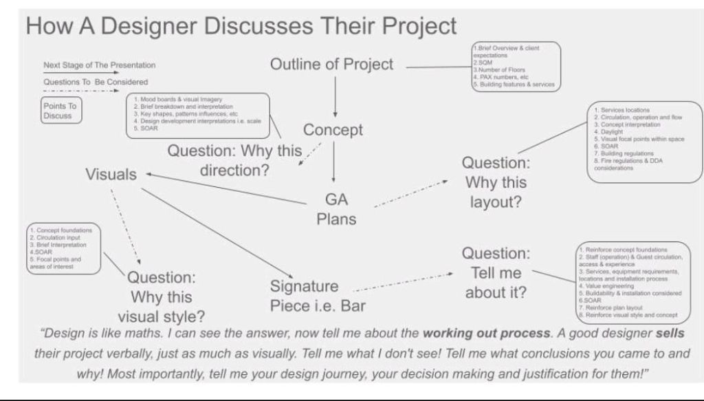 What you say about a project is just as important if not more so than what you produce. I want to hear about the journey, the challenges and the decision making with justification. Think of it like a maths question – the answer is the visual and the plan, your speech and presentation is the working out. Show your design thinking, your problem solving, your value engineering and your forward thinking abilities to really stand out from the rest and show you are industry ready!